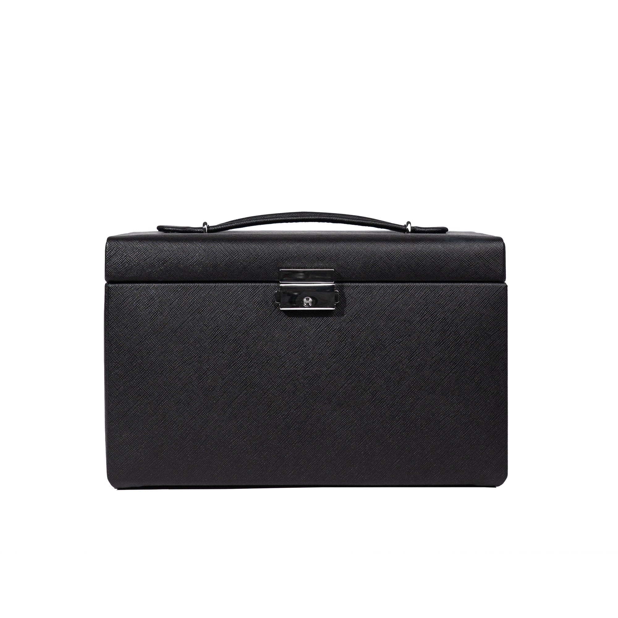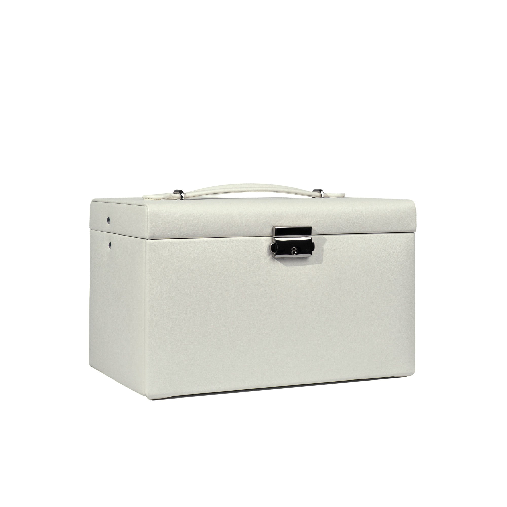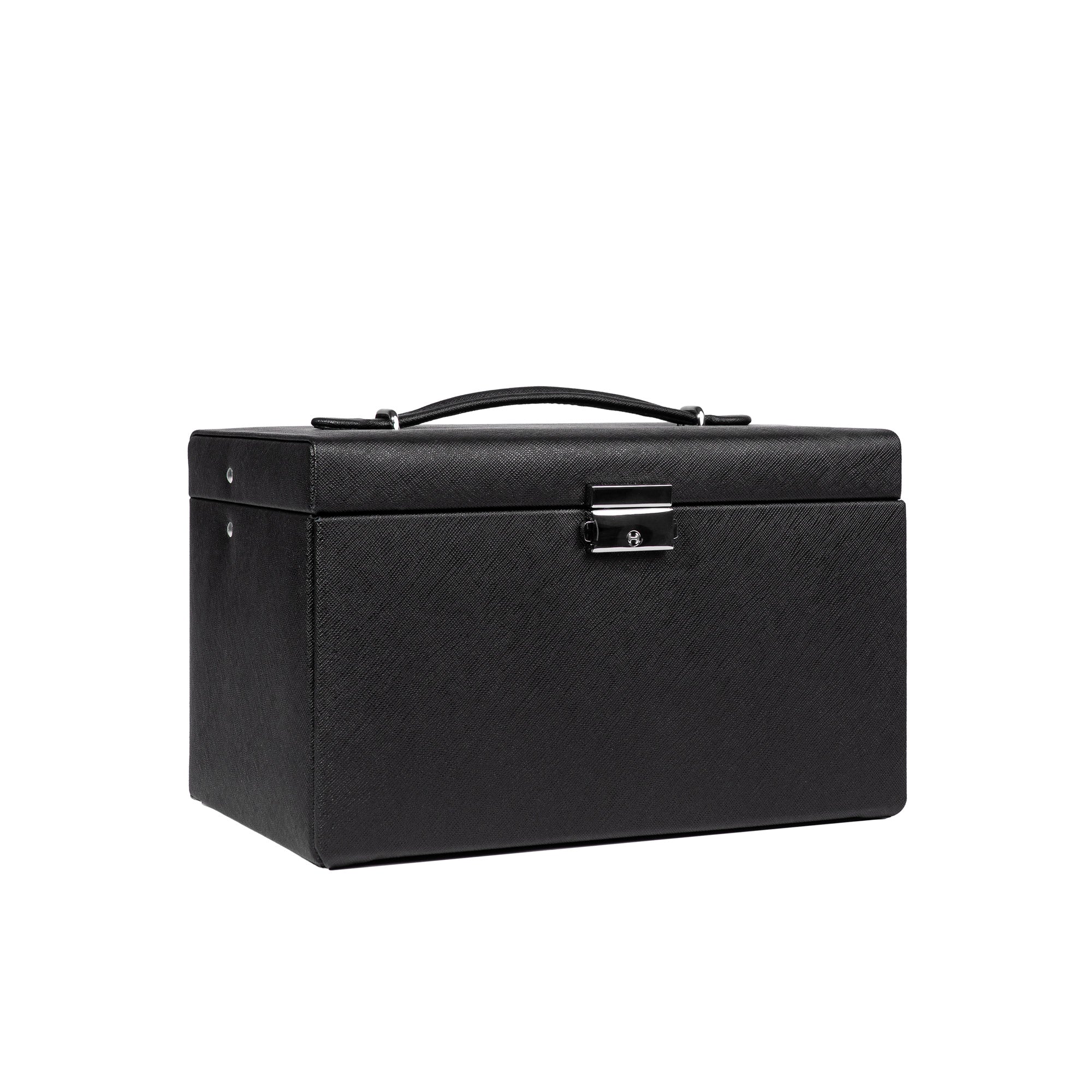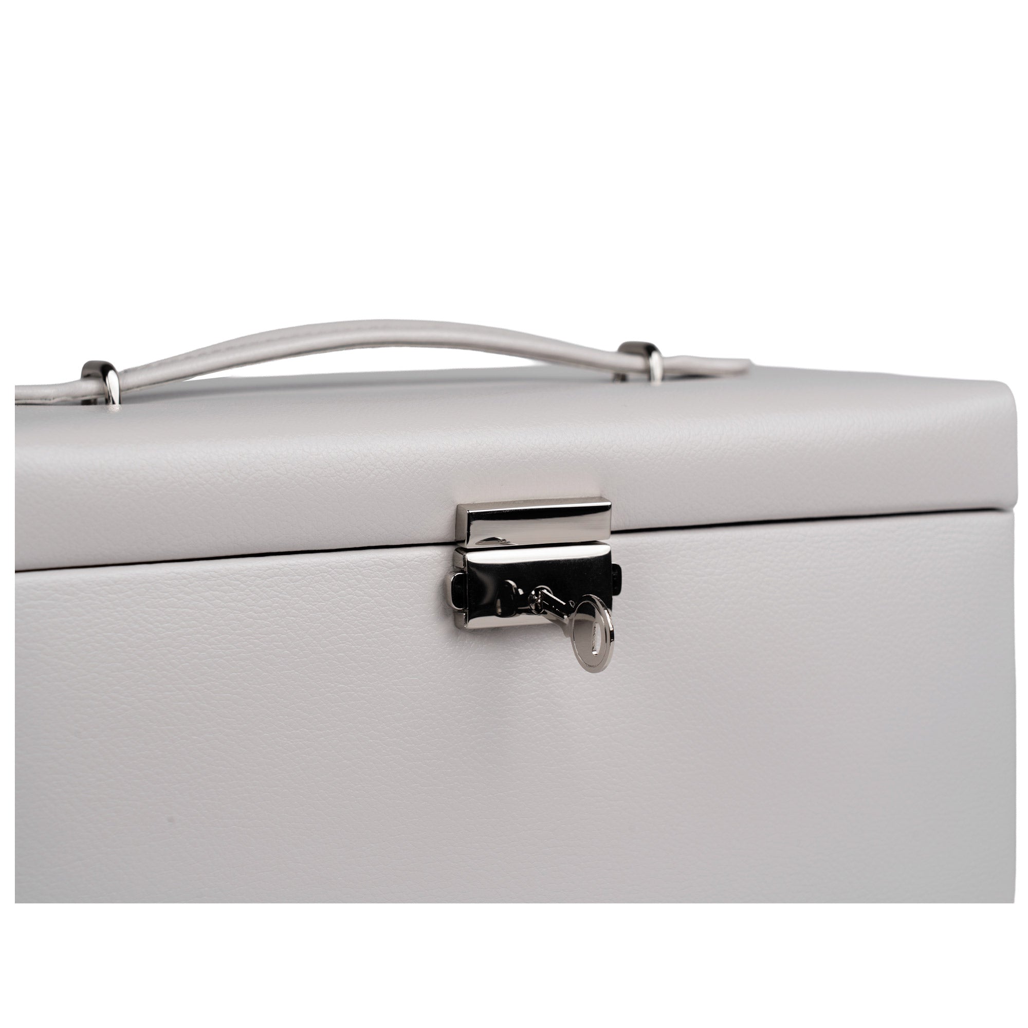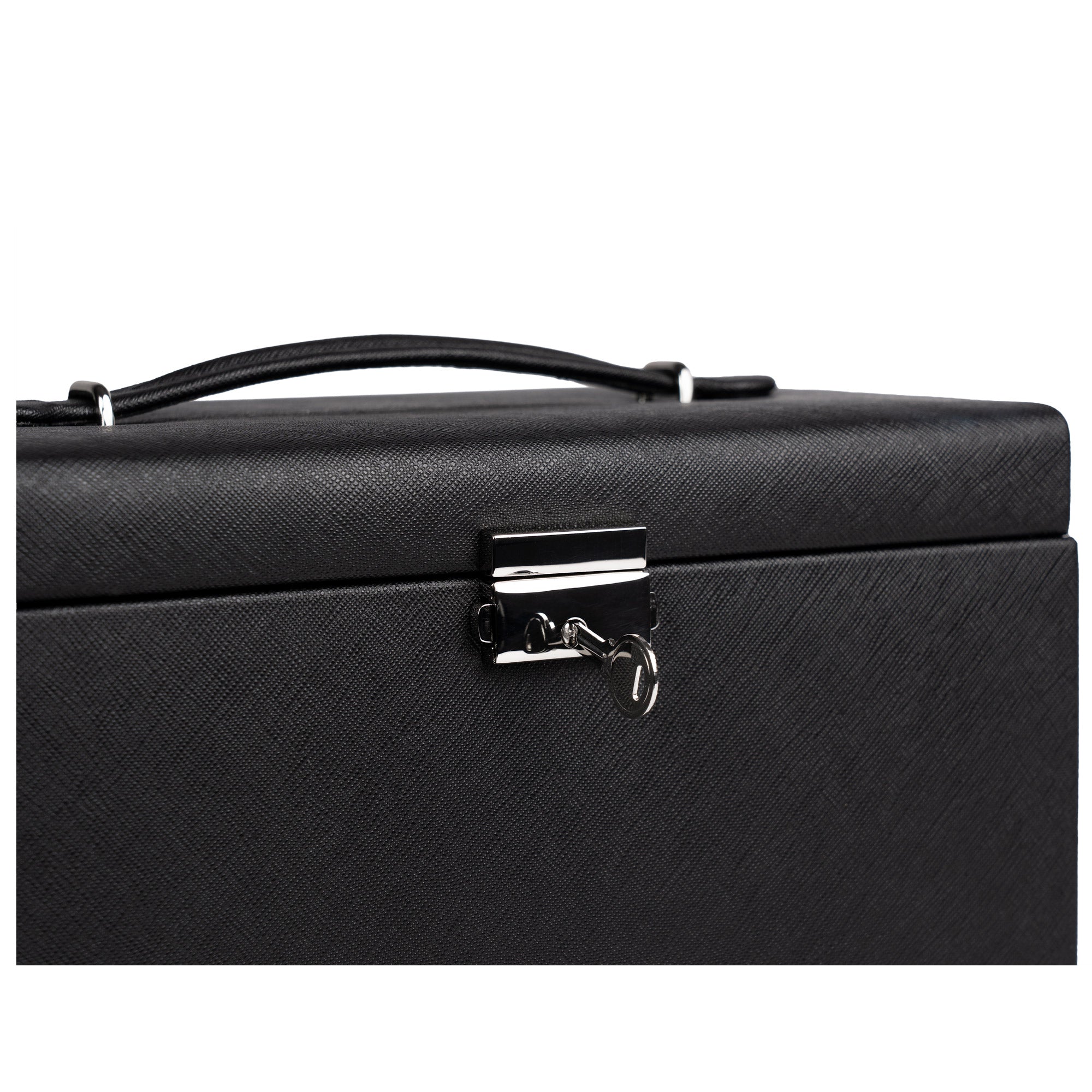 Die klassische Form mit ihrer intelligenten Aufteilung bietet genügend Platz auf verschiedenen Ebenen. Die Schubladen, Ringe, Spiegel und Broschenleiste sind alle hochwertig verarbeitet und schützen die wertvollen Schmuckstücke. Dank des Tragegriffs und dem abschließbaren Schloss ist der Schmuckkoffer auch auf Reisen sicher zu transportieren.