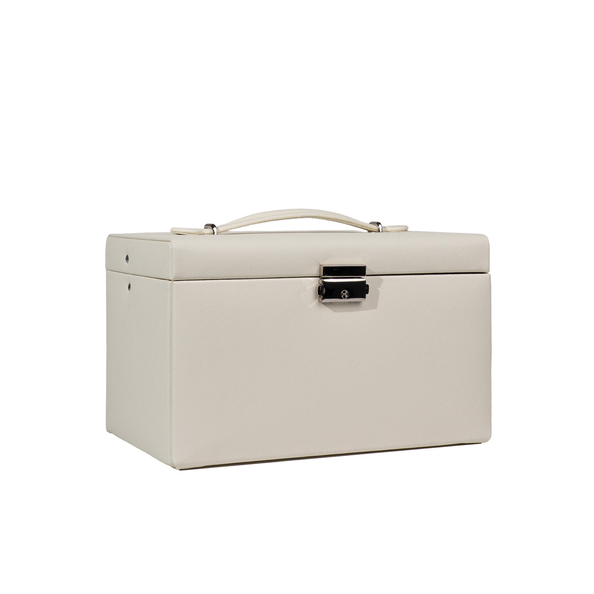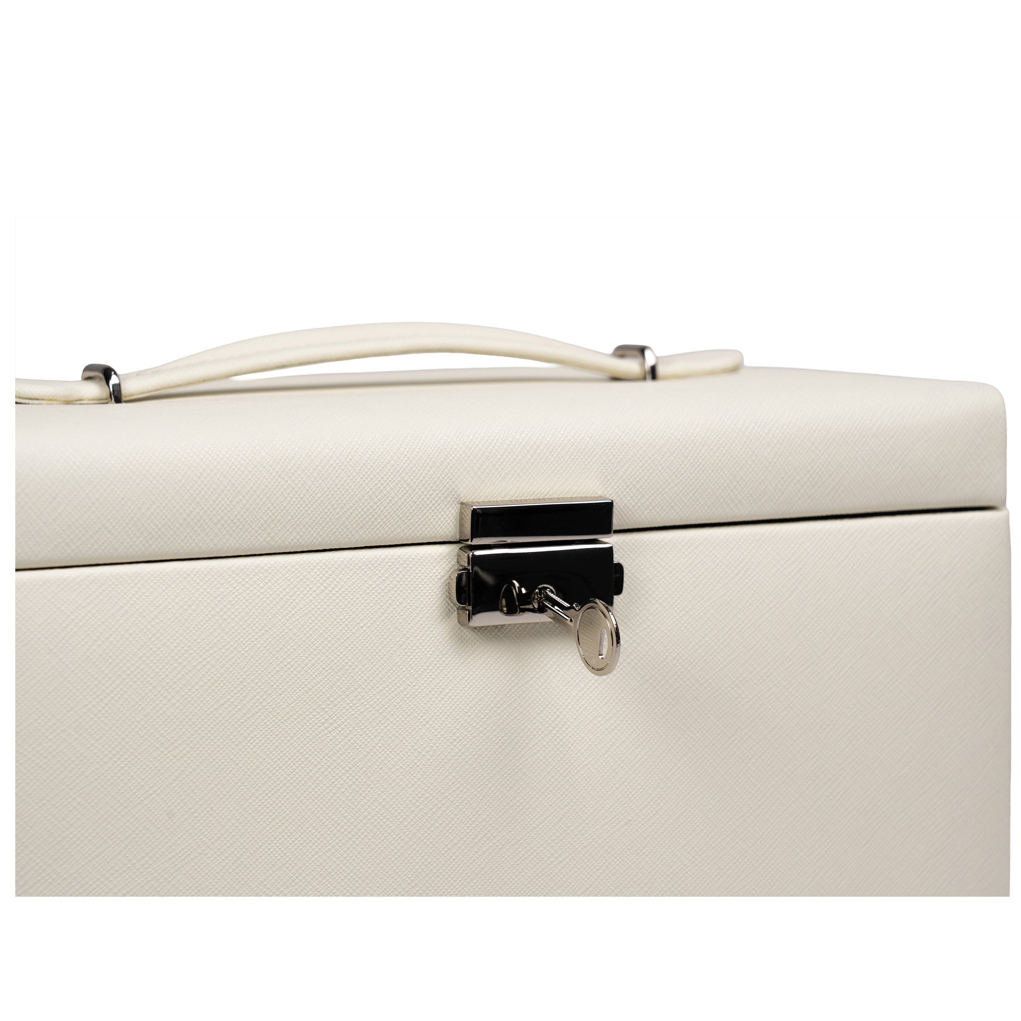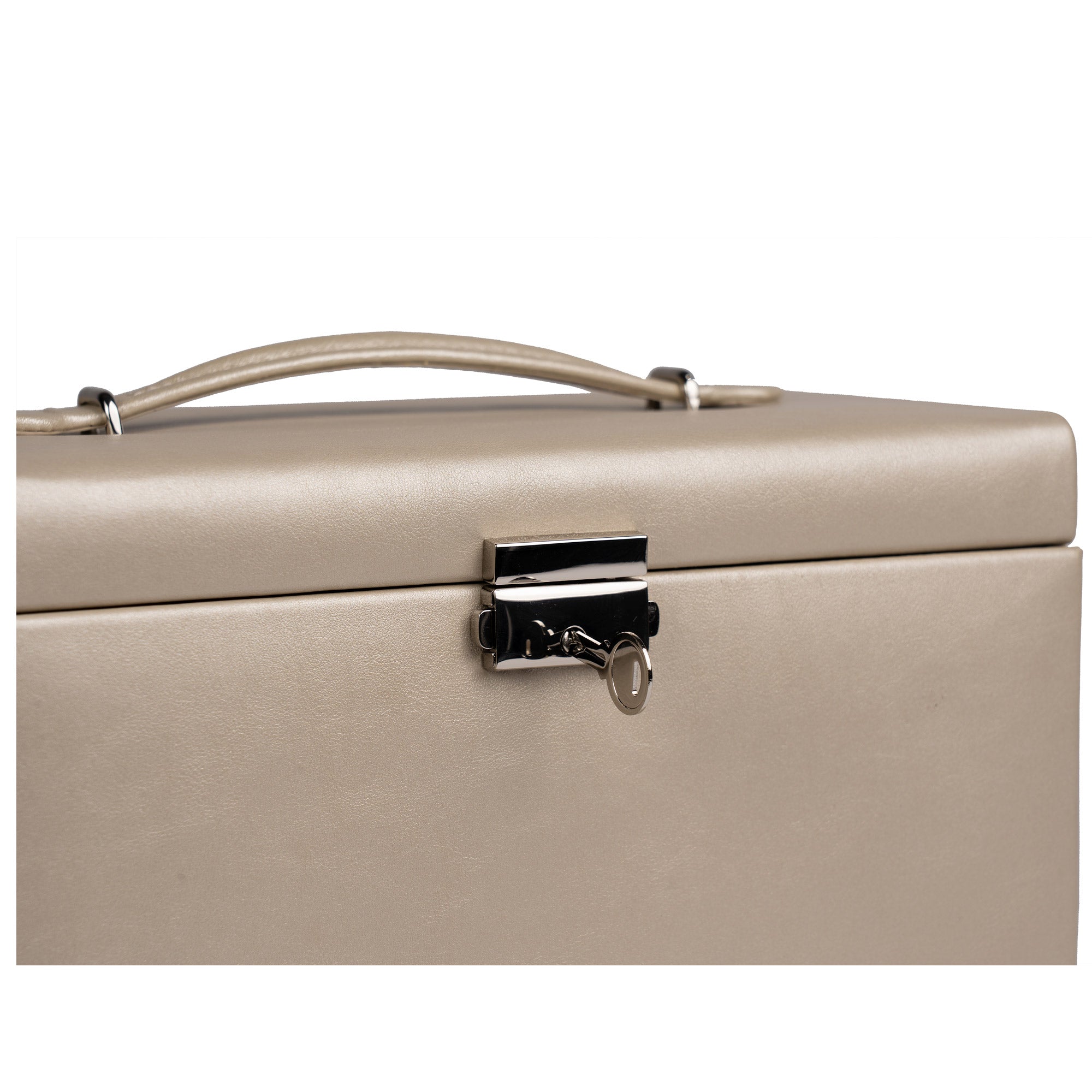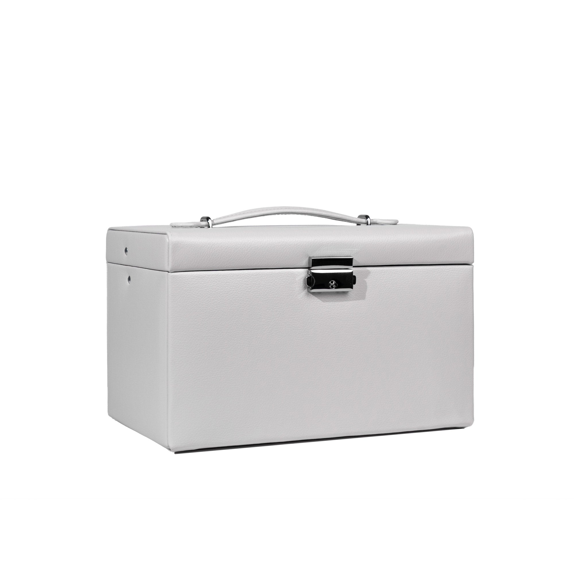 Die klassische Form mit ihrer intelligenten Aufteilung bietet genügend Platz auf verschiedenen Ebenen. Die Schubladen, Ringe, Spiegel und Broschenleiste sind alle hochwertig verarbeitet und schützen die wertvollen Schmuckstücke. Dank des Tragegriffs und dem abschließbaren Schloss ist der Schmuckkoffer auch auf Reisen sicher zu transportieren.
