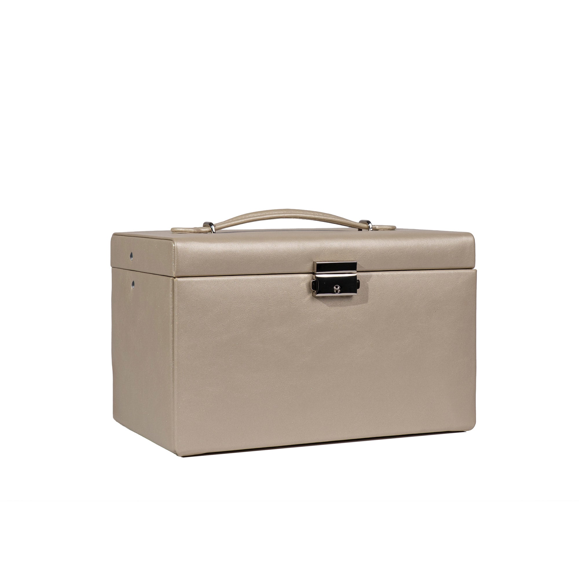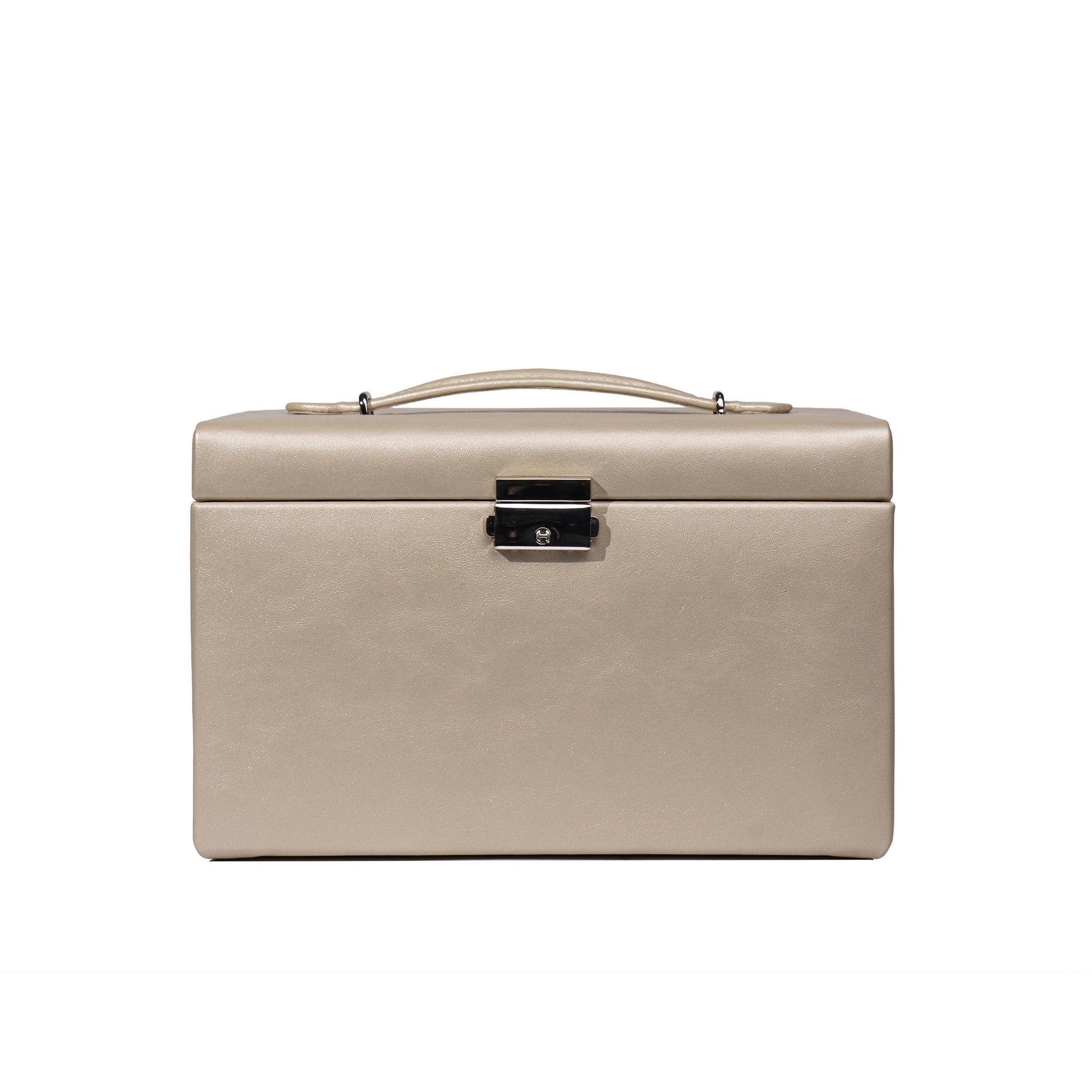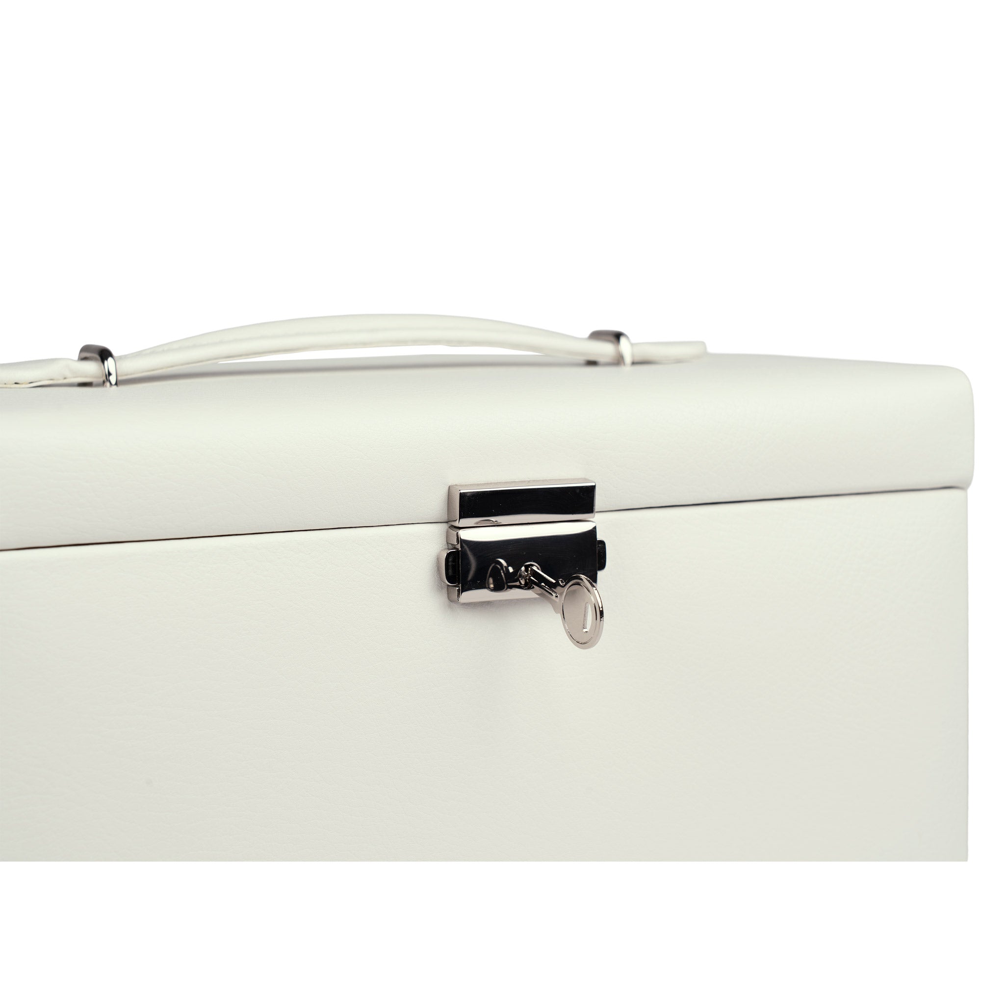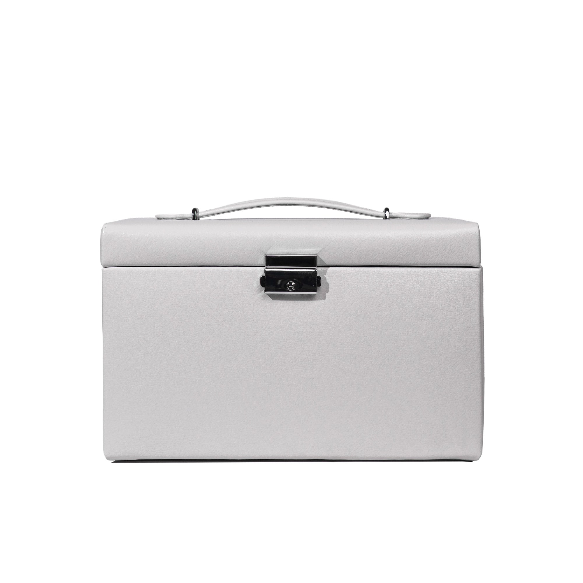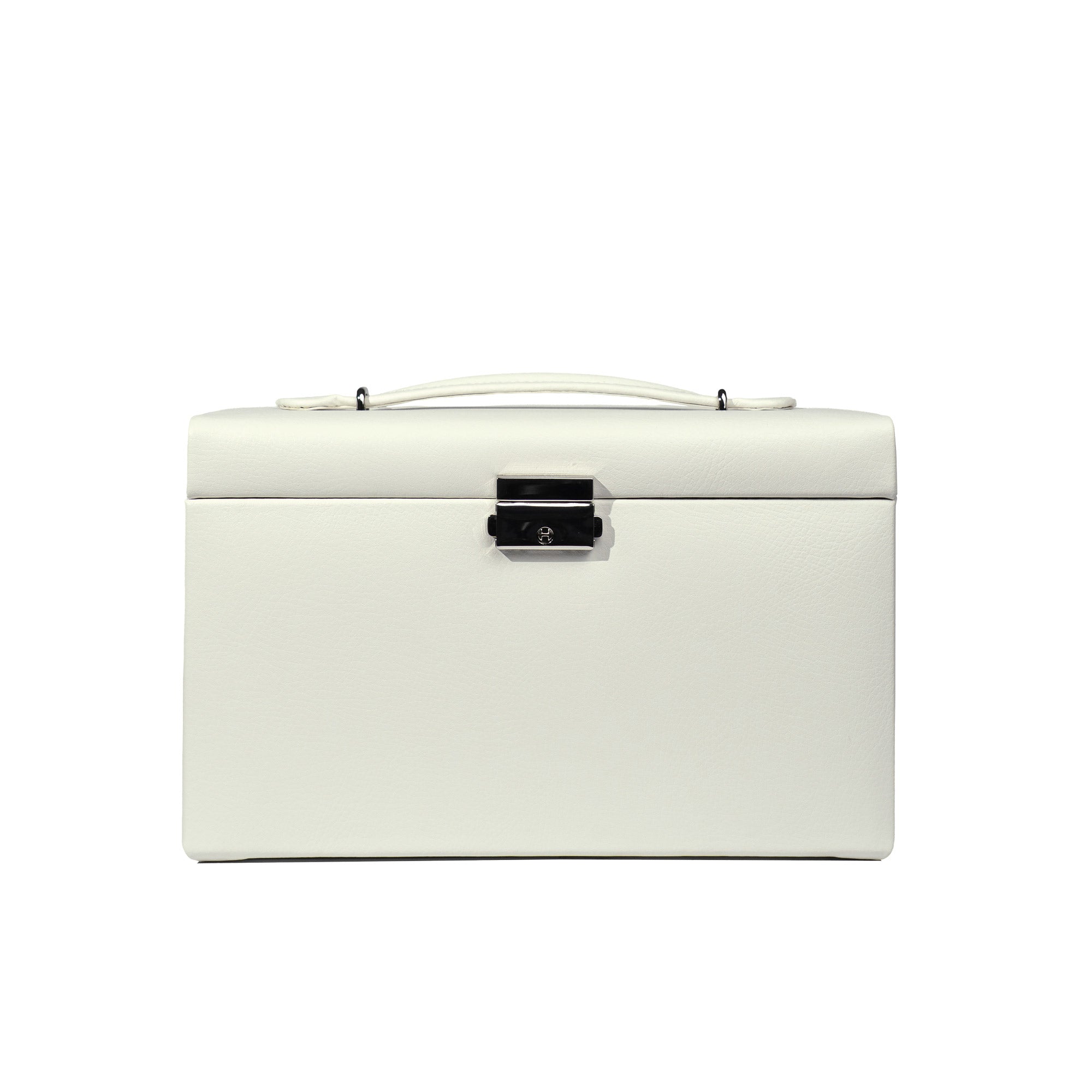 Die klassische Form mit ihrer intelligenten Aufteilung bietet genügend Platz auf verschiedenen Ebenen. Die Schubladen, Ringe, Spiegel und Broschenleiste sind alle hochwertig verarbeitet und schützen die wertvollen Schmuckstücke. Dank des Tragegriffs und dem abschließbaren Schloss ist der Schmuckkoffer auch auf Reisen sicher zu transportieren.